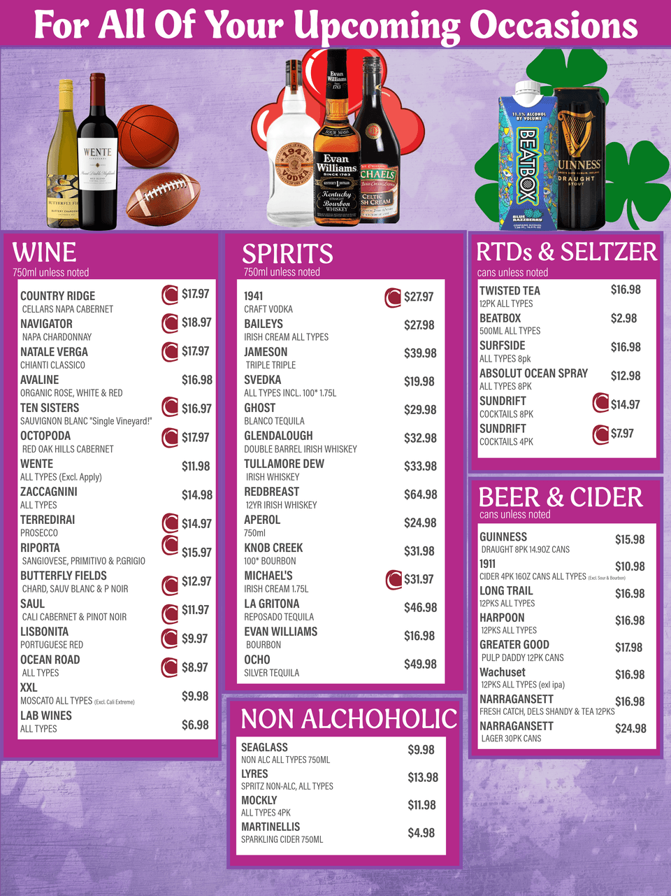 VodkaBourbon WhiskeyMezcalRumCordials/LiqueursGinPre-Mixed Cocktails